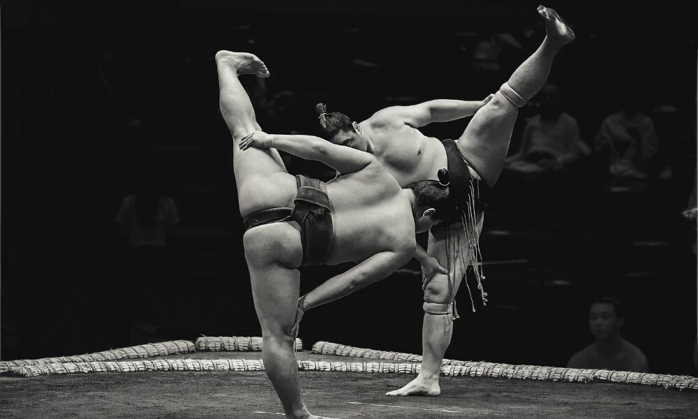 ひざに手を当て、四股を踏みます。お相撲さんが四股を踏む動作で、片足を上げ、しばらくその姿勢をキープした後、力強く足を地面に下ろします。