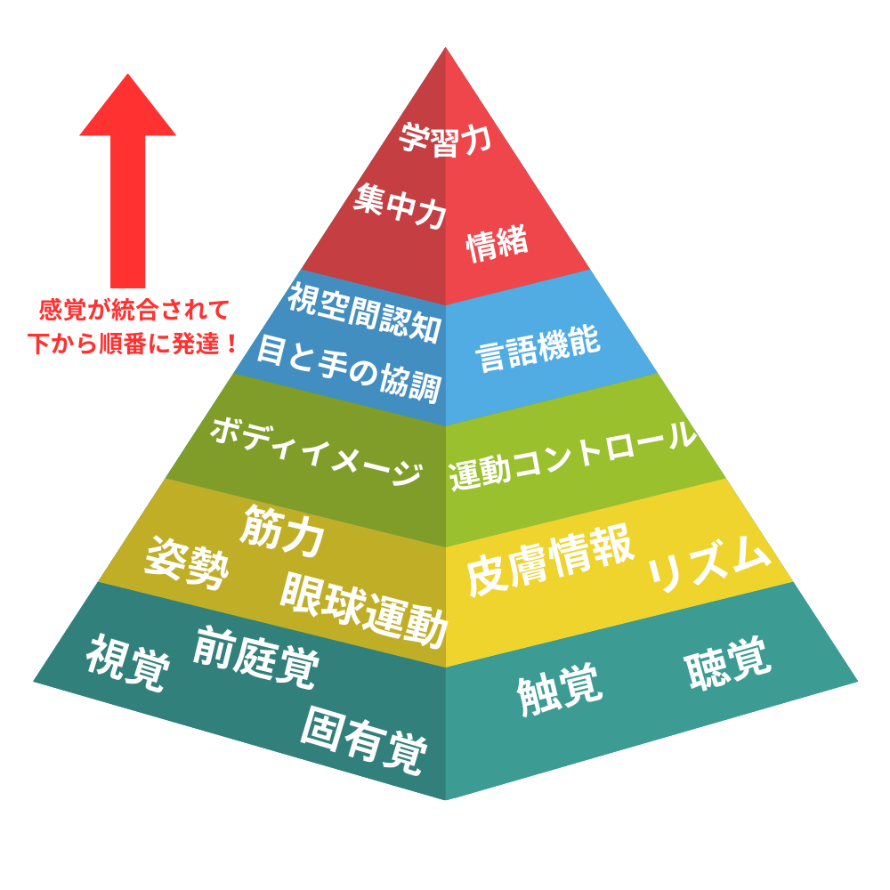 こんなふうに1番下の基礎となる感覚が土台にあって、より複雑な機能がどんどん積み重なりあい、最後に集中力や学習力が積み上がっていくんですね。この積み重なっていく過程を感覚統合といいます。
