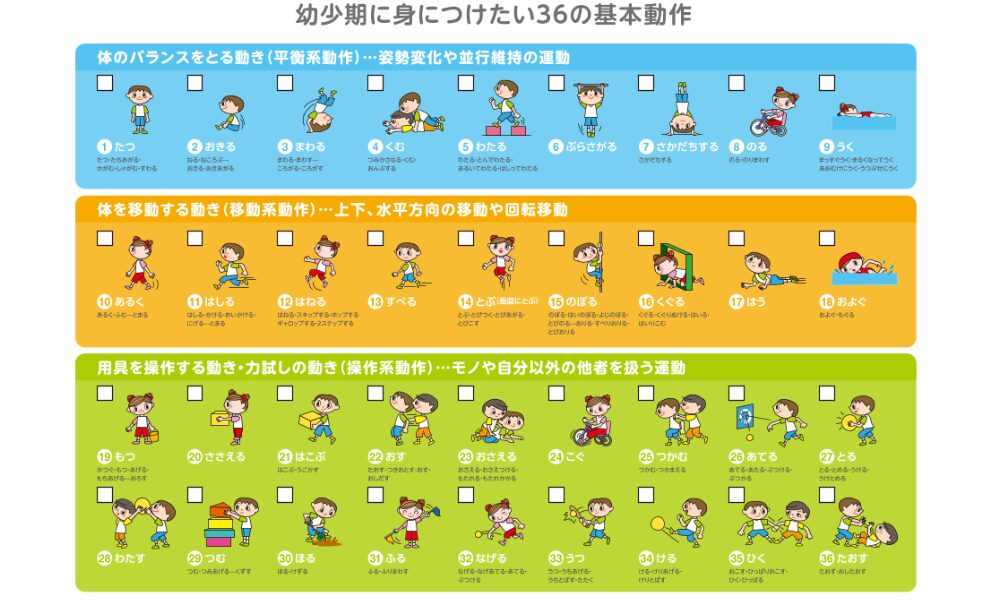 ミズノ株式会社がスポーツ庁の委託を受けて作成した「36の基本動作」は、幼児期の運動発達をサポートする指標としてとても参考になります。