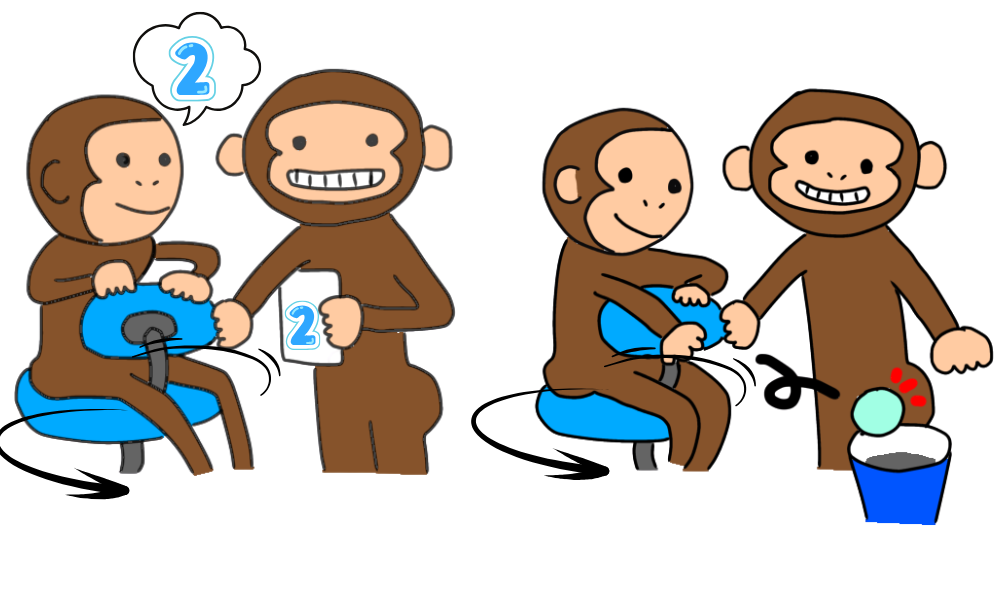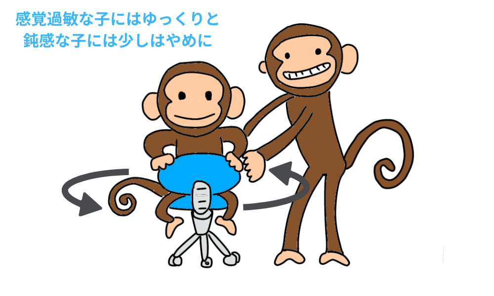 慣れてきたら、いすを回しながら「数字カードを見せて声に出して読ませる」「好きなキャラクターの絵を見せて名前を言ってもらう」「バケツを用意してボールなどを入れてもらう」など、回りながら何かする。を心がけると「前庭覚」を使うと同時に「視覚」も使うことになるので、いい感覚遊びになります。